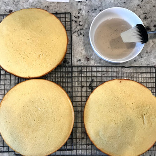 Using a large serrated knife or a cake leveler, slice a thin layer off the tops of the cakes to create a flat surface. Discard (or crumble over ice cream!). Generously brush lavender syrup on the top of each cake. I use every last drop!